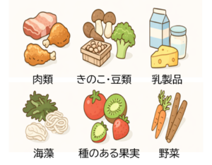 | 肉類 | 鶏むね肉、ささみ、牛モモ、牛ヒレ、豚モモ、豚ヒレ(脂肪が少ないもの) |