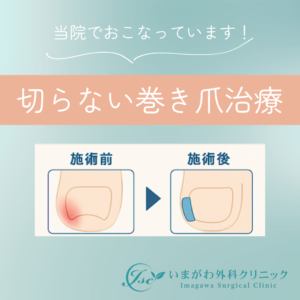 いまがわ外科クリニックの外科では、巻き爪(陥入爪)や粉瘤・脂肪腫などの“できもの”治療。いぼ・ほくろの除去など美容診療まで、「かかりつけ外科医」として幅広い診療を行っています。外科専門医による安心・安全な治療をうけていただけます。