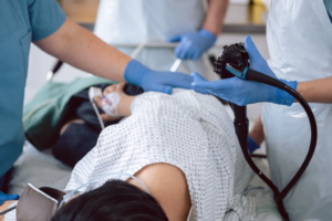結腸を栄養する動脈(結腸動脈)の虚血により、腸の粘膜が壊死し、腹痛や下血を生じます。高血圧や糖尿病、脂質異常症を持つ患者さんに多く発生し、結腸動脈の硬化が原因です。便秘や下痢などにより腸内圧が亢進することも発症のきっかけとなります。症状は数日で改善することが多いですが、点滴治療が必要になるため、原則として入院が必要です。